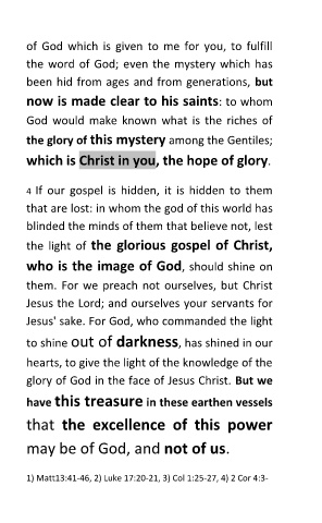 1) Matt13:41-46, 2) Luke 17:20-21, 3) Col 1:25-27, 4) 2 Cor 4:3-