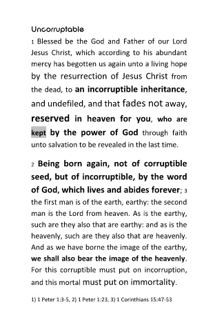1) 1 Peter 1:3-5, 2) 1 Peter 1:23, 3) 1 Corinthians 15:47-53