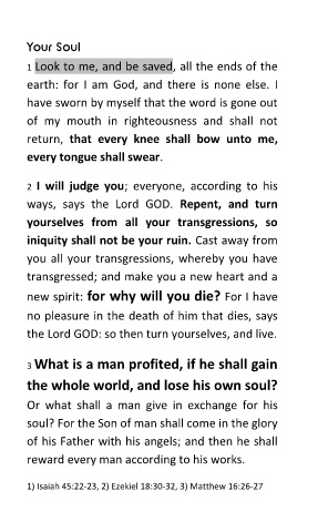 1) Isaiah 45:22-23, 2) Ezekiel 18:30-32, 3) Matthew 16:26-27